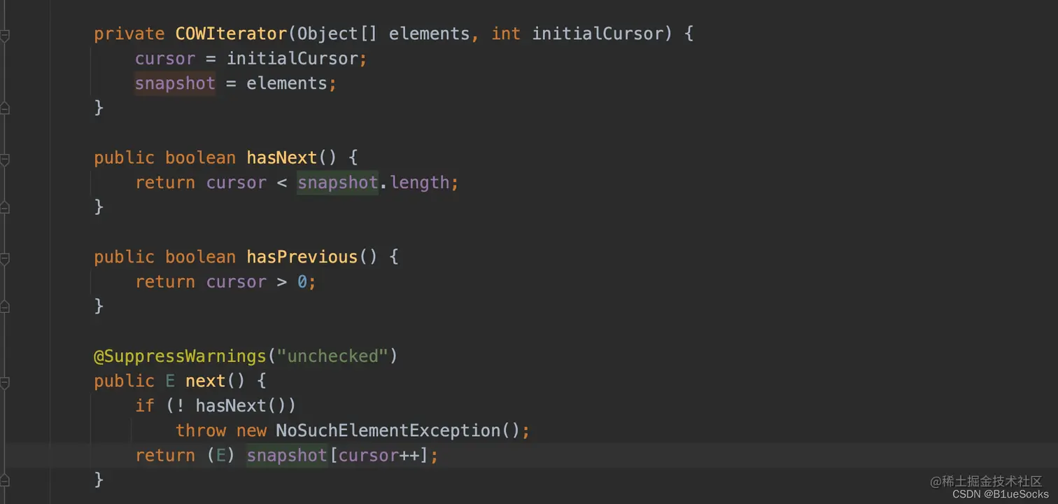 同时在其next中也没有对像ArrayList中那样对modCount的校验,当然也就不存在并发操作异常的情况了。应该是很多开发者在将这种“机制”对比于fail-fast取名为“Fail-Safe”。(至少在文档中是没看到这个词的)。