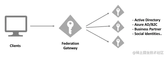 通用架构是所谓的联合网关。在此方法中,IdentityServer充当一个或多个外部身份提供商的网关。