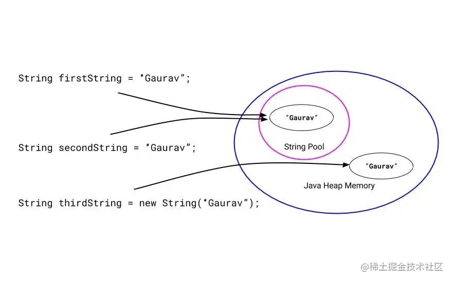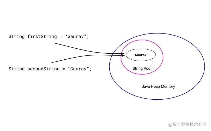 看到上面的代码,只有两个字符串对象将被创建。前两个变量将引用同一个字符串对象,其值为 "Gaurav"。JVM使用字符串池的概念,将重复的字符串对象只存储一份到字符串常量池。