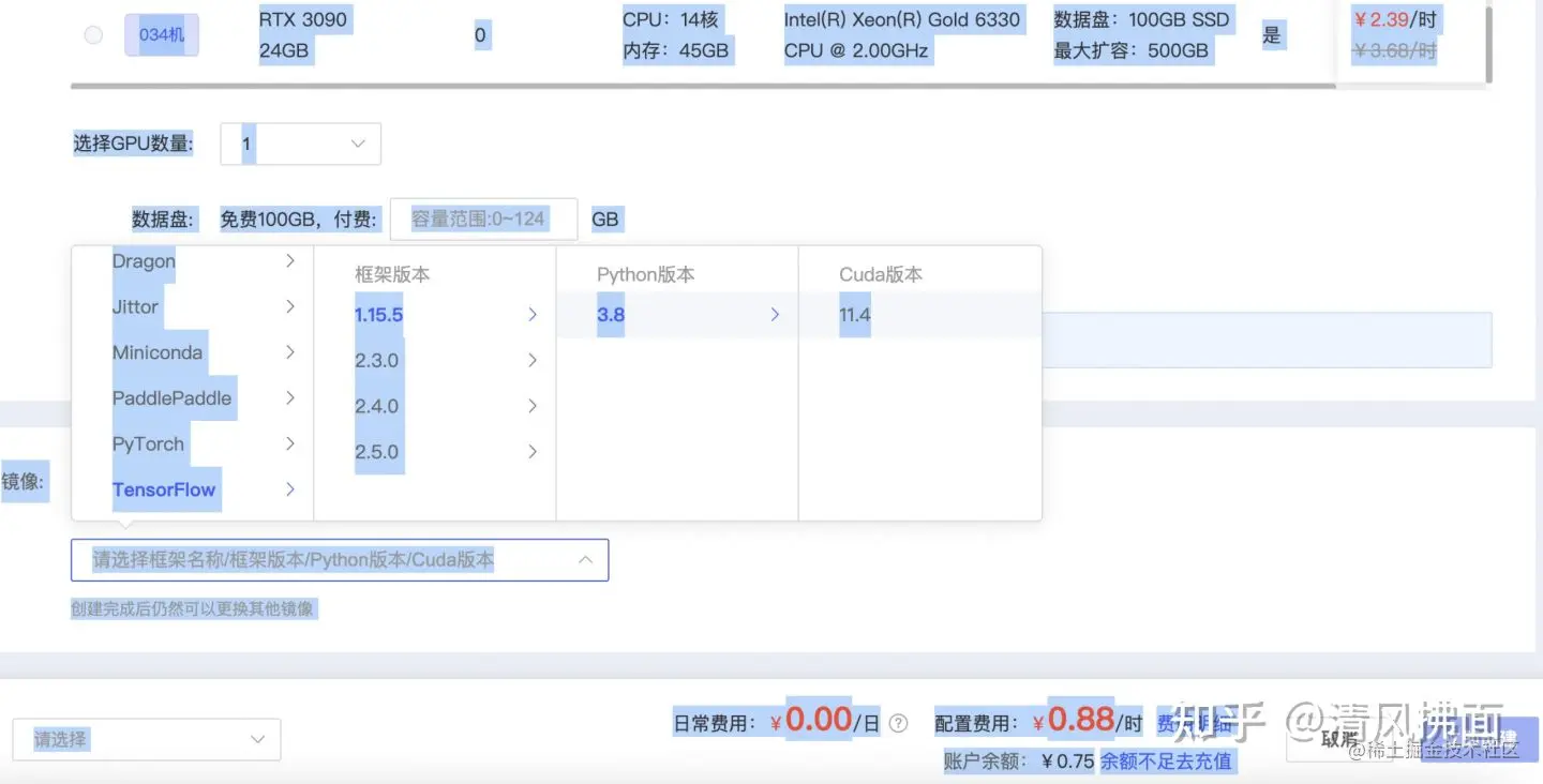 6、选择训练镜像 我们目前以bert4keras为教程基础 所以我们选择tensorflow 1.15.5 python 3.8 cuda 11.4版本