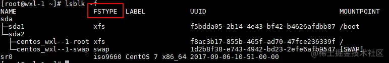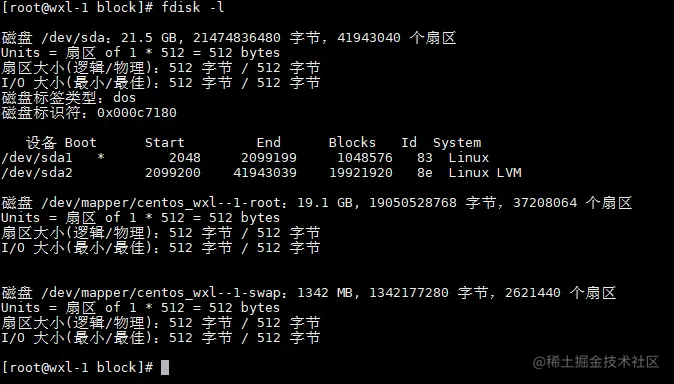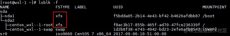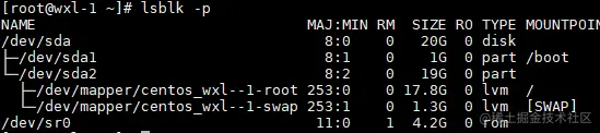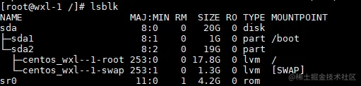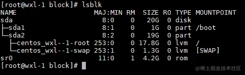├─centos_wxl--1-root 253:0 0 17.8G 0 lvm /