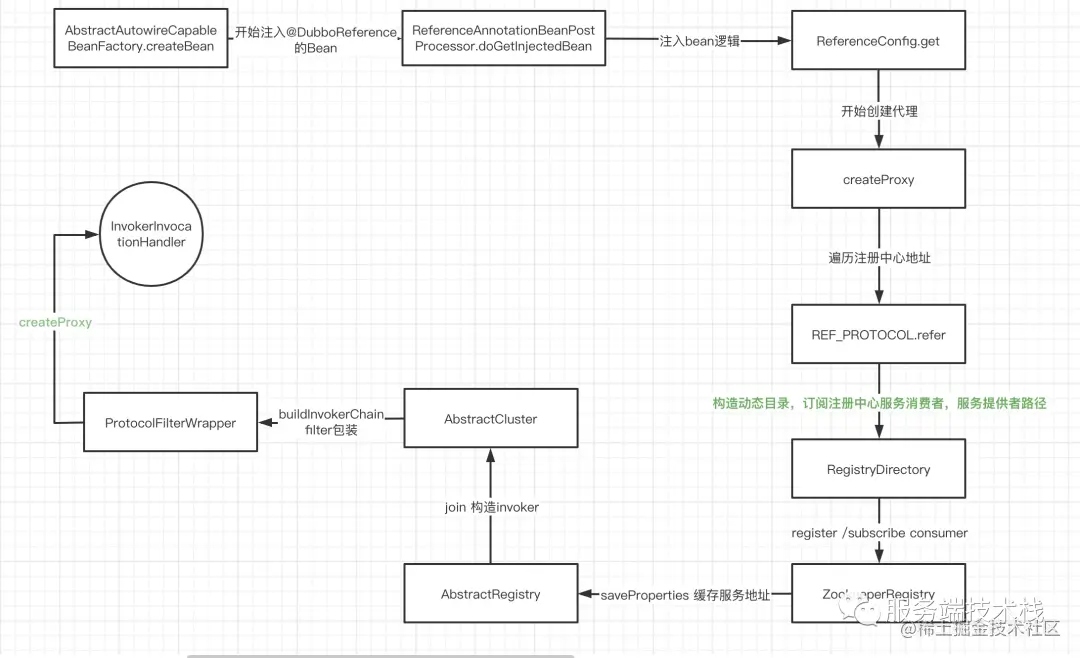 总共有两种机制时机来引用服务: 第1是俄汉式(默认),在ReferenceBean类的afterPropertiesSet方法中,第2种是是在 ReferenceBean 对应的服务被注入到其他类中时引用(dubbo:Reference标签中init属性配置成true时候)