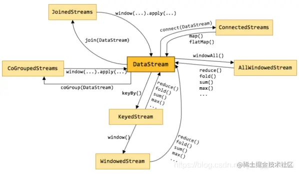 - 第三类是对多个流进行操作并转换为单个流。例如,多个流可以通过 Union、Join 或 Connect 等操作合到一起。这些操作合并的逻辑不同,但是它们最终都会产生了一个新的统一的流,从而可以进行一些跨流的操作。