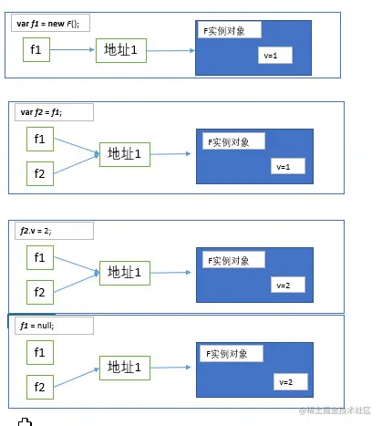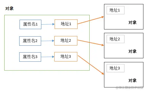 对于对象类型的属性来说,属性名知识指向了保存对象的内存地址,而不是执行实际的对象,代码演示如下:
