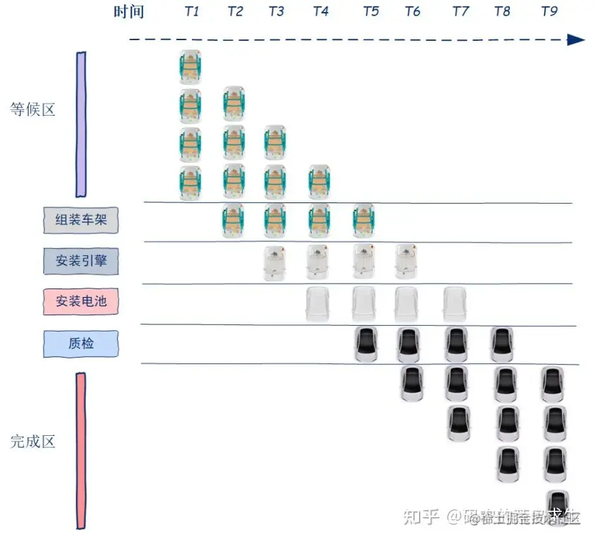 现在,让我们仔细观察一下特斯拉流水线,你会发现当前一辆车还没有完全制造完成时后一辆车就已经进入到流水线了。