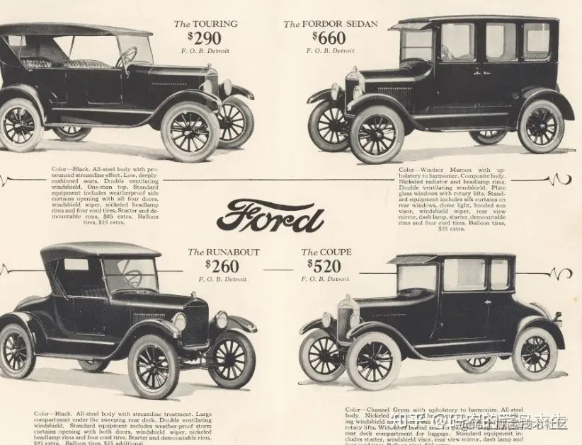 20世纪初,福特将流水线技术应用到汽车批量生产上,生产效率提高千倍,使得汽车这种奢侈品开始能够为大众消费,深刻影响了现代社会的方方面面,注意上图中一辆车的价格。。。