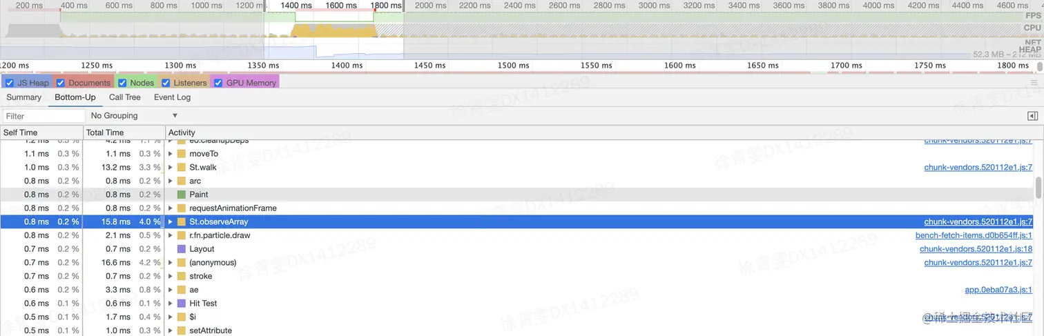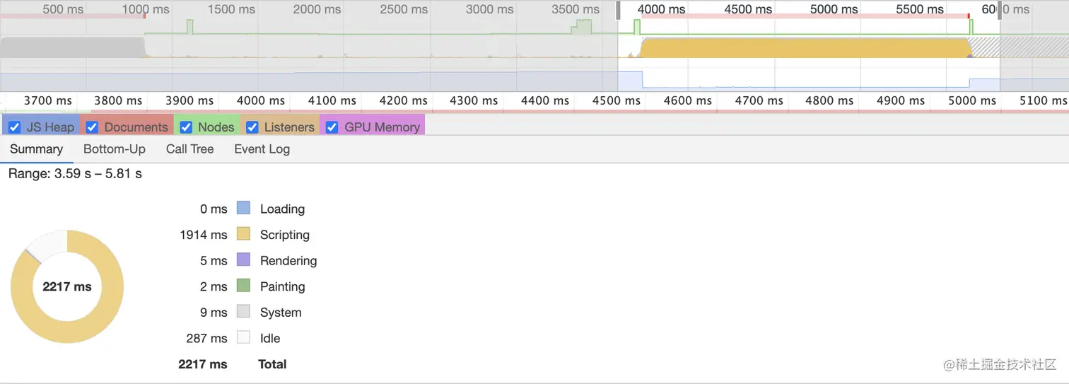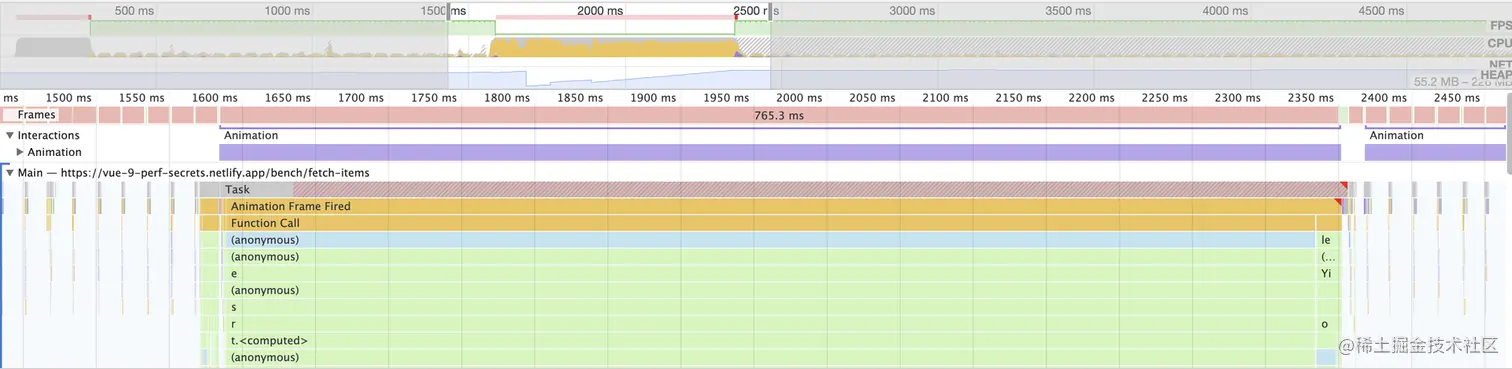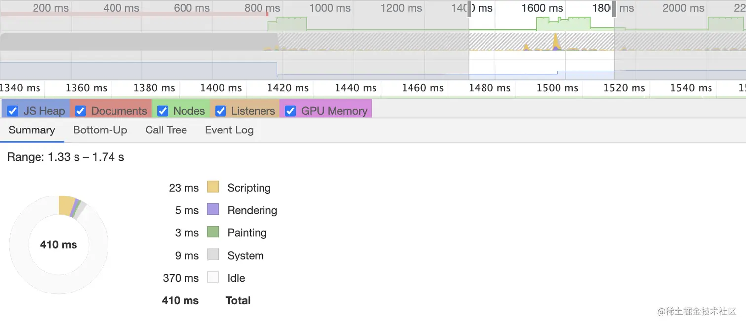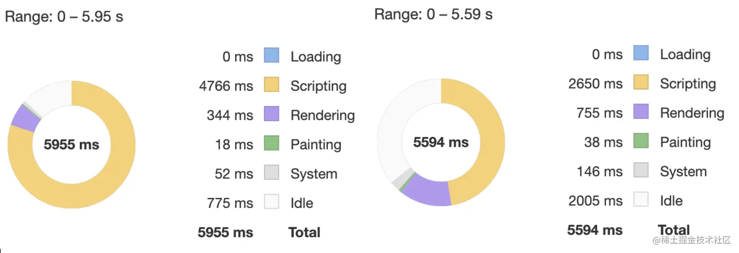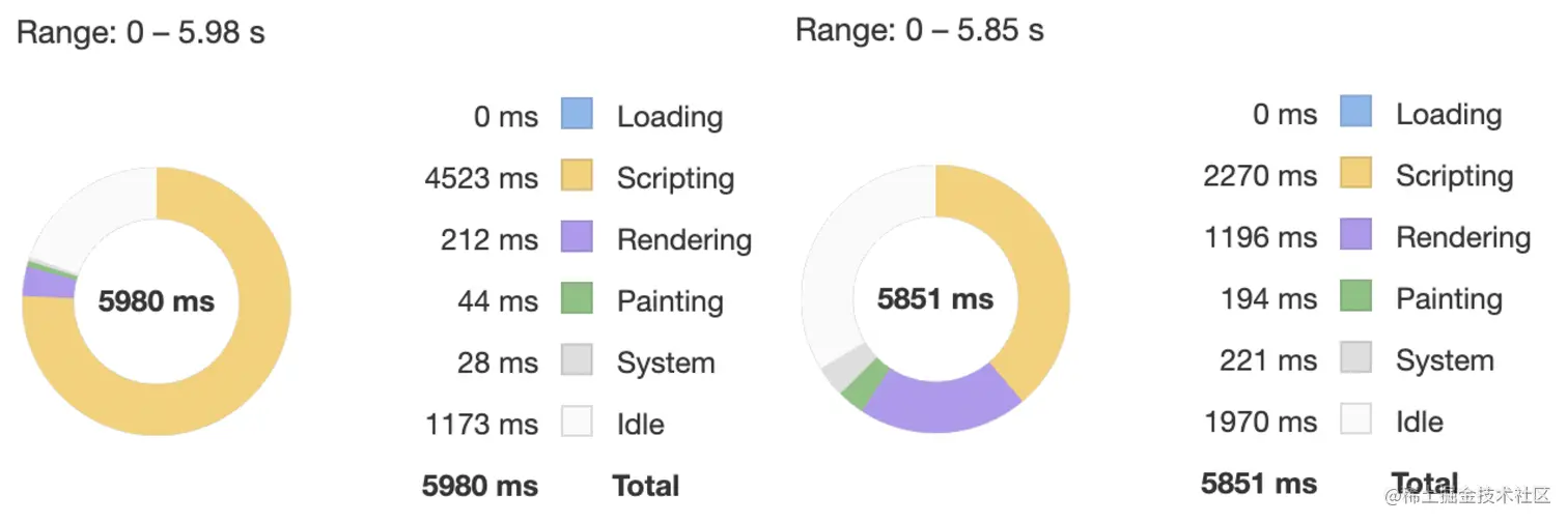 **另:**在执行耗时任务处理时,我们通常会加一个 loading 效果,但通过优化前后对比可以发现:优化前 JS 一直长时间运行,阻塞 UI 进程,因此并不会展示 loading 动画;优化后由于将耗时任务拆成多个时间片提交,单次 JS 运行时间变短了,loading 动画也有机会渲染了。