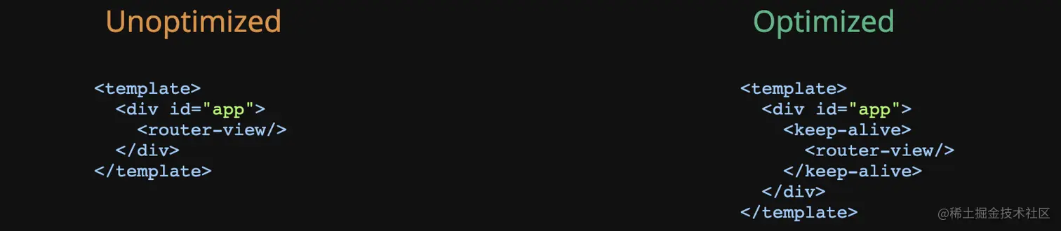 **原理:**在非优化场景下,我们每次点击按钮切换路由视图,都会重新渲染一次组件,渲染组件就会经过组件初始化,render、patch 等过程,如果组件比较复杂,或者嵌套较深,那么整个渲染耗时就会很长。而在使用 KeepAlive 后,被 KeepAlive 包裹的组件在经过第一次渲染后的 vnode 以及 DOM 都会被缓存起来,然后再下一次再次渲染该组件的时候,直接从缓存中拿到对应的 vnode 和 DOM,然后渲染,并不需要再走一次组件初始化,render 和 patch 等一系列流程,减少了 script 的执行时间,性能更好。
