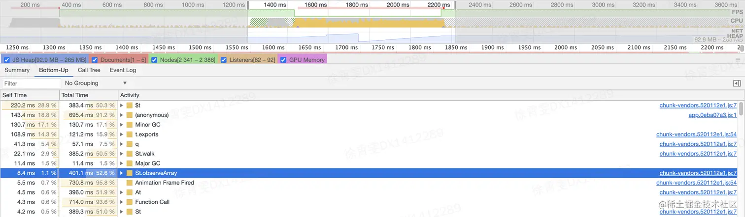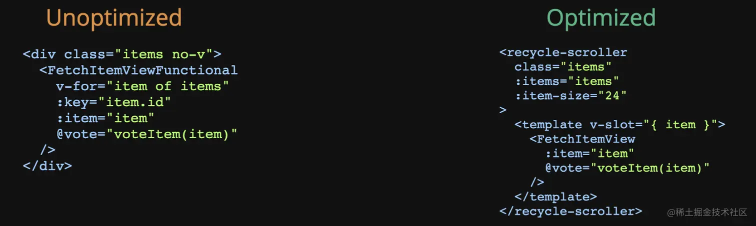 **原理:**虚拟滚动的实现方式是仅渲染视图范围内的 DOM,渲染内容少时性能自然会好很多。虚拟滚动组件也是 Guillaume Chau 写的,感兴趣的同学可以去研究它的源码实现,基本原理就是监听滚动事件,动态更新需要显示的 DOM 元素,计算出它们在视图中的位移。虚拟滚动组件也并非没有成本,因为它需要在滚动的过程中实时去计算,所以会有一定的 script 执行的成本。因此如果列表的数据量不是很大的情况,我们使用普通的滚动就足够了。