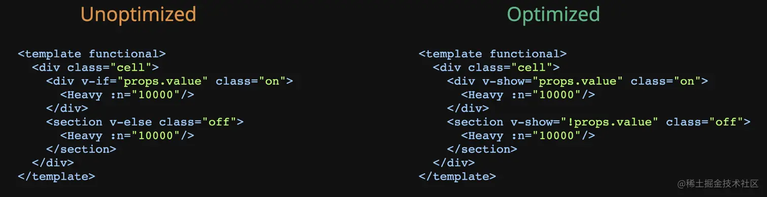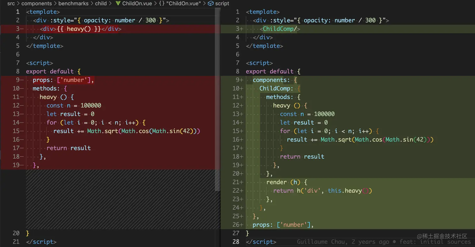 **原理:**在优化前的代码中,每次 props 传入的 number 发生变化时都会重新渲染,在渲染的过程中又会重新调用 heavy 函数进行耗性能的运算。而优化后的代码逻辑是将复杂运算封装在子组件内,由于 Vue 的更新是组件粒度的,当传入的 number 发生变化时,父组件会重新渲染,而子组件由于并不依赖 number 因此并不会重新渲染。执行计算的次数少了,性能自然也提升了。