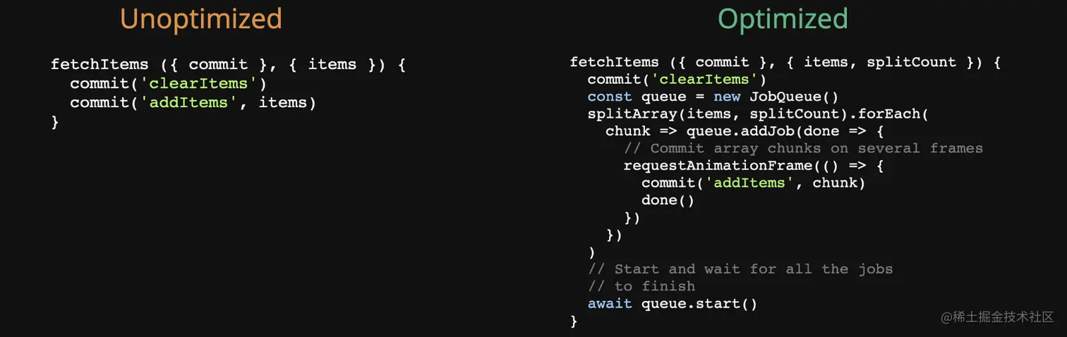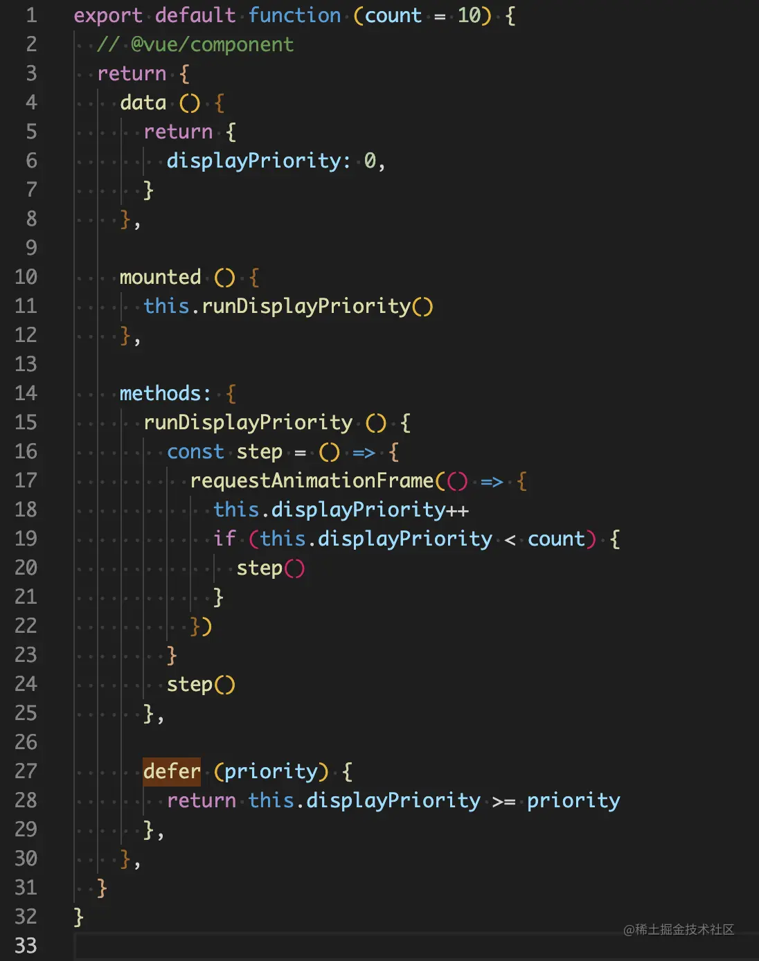 **原理:**Defer 的主要思想就是把一个组件的一次渲染拆成多次,它内部维护了 displayPriority 变量,然后在通过 requestAnimationFrame 在每一帧渲染的时候自增,最多加到 count。然后使用 Defer mixin 的组件内部就可以通过 v-if="defer(xxx)" 的方式来控制在 displayPriority 增加到 xxx 的时候渲染某些区块了。
