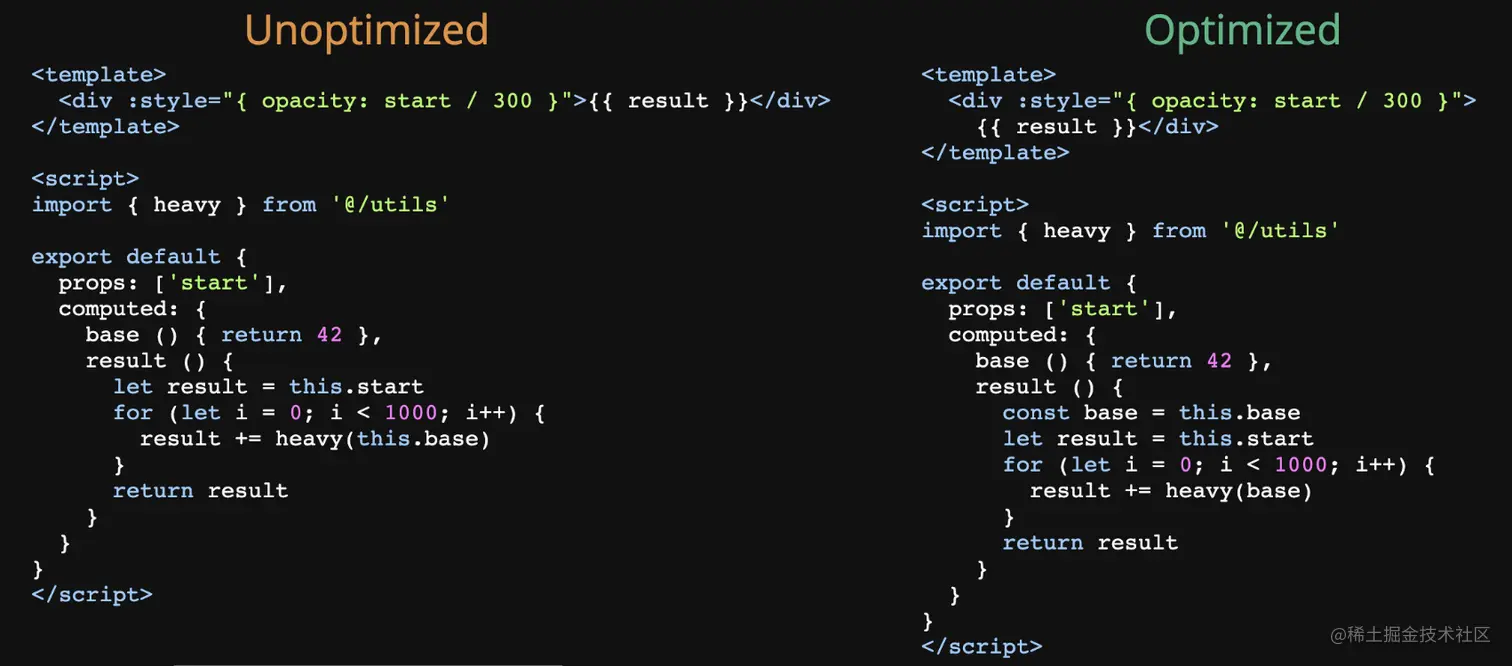 **原理:**对比前后代码可以发现区别在于:优化前的代码在进行计算时每次都直接引用 this.base,而优化后的代码将 this.base 使用局部变量 base 进行了缓存,在之后的计算中都调用局部变量进行计算。为什么会造成如此明显的性能差异呢?原因在于每次访问 this.base 时,由于 this.base 是计算属性,因此会执行一段逻辑代码查看已有的依赖项是否发生变化,如果发生变化则重新计算,没有则返回上一次计算值。这类计算逻辑的性能消耗在仅仅多调用几次时可能还不明显,但执行多了(类似示例每帧更新 300 个组件,每个组件在一次更新内又调用了多次 this.base)则会有比较大的性能差异。