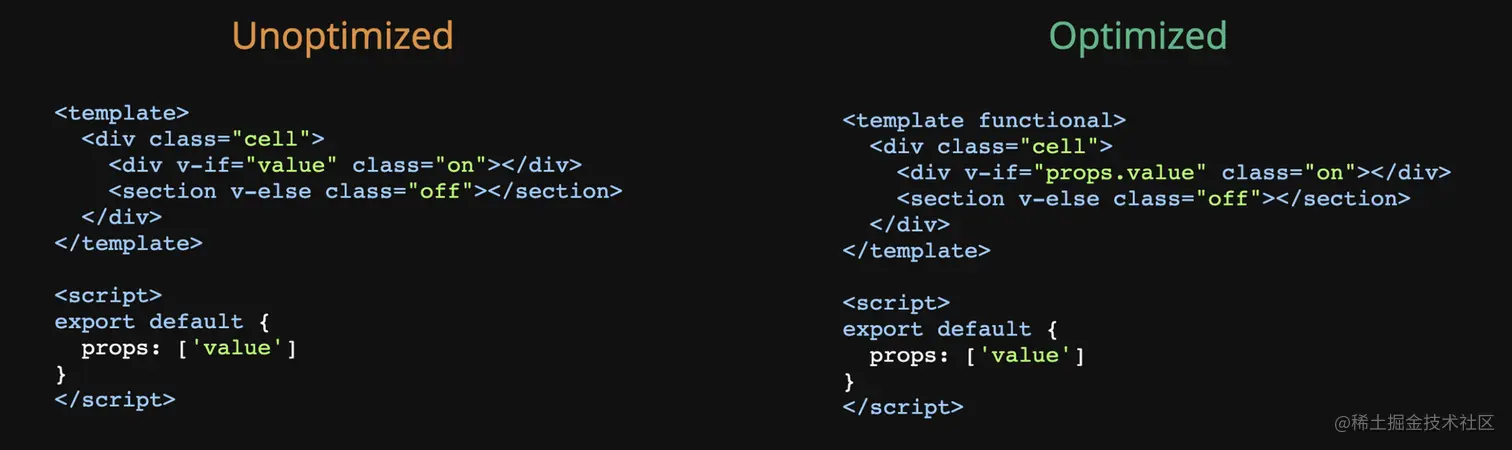 原理:函数式组件与普通组件相比,它没有状态(没有响应式数据),没有实例 (没有 this 上下文)。我们可以把函数式组件想像成组件里的一个函数,入参是渲染上下文(render context),返回值是渲染好的 HTML。正是因为函数式组件精简了很多例如响应式和钩子函数的处理,因此渲染性能会有一定提高。