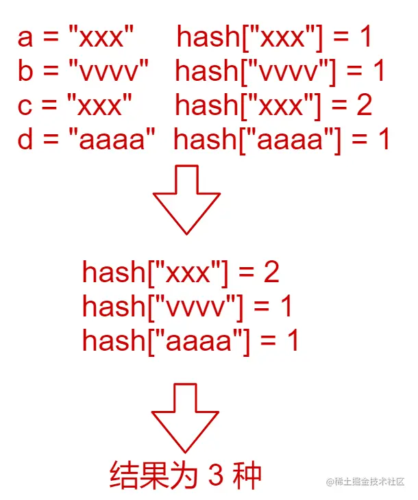 - 题目要求,给出单词,我们要转换成对应的字符串,且在给出的单词数组中,不同的单词,可能存在相同的拼接结果字符串,那么,我们需要计算出,这些结果字符串中,不同种类的字符串翻译