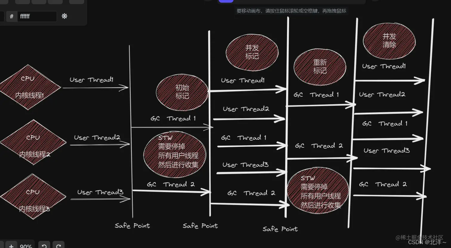 根据上一步和GC Roots直接关联的对象进行遍历整个堆里面的对象图并进行标记,由于是并发的所以并==不需要停顿用户线程==,但是比较耗时因为遍历整个对象图。