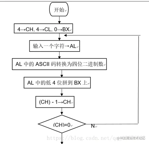 5.先输入4个字符,将ASCII码转化成二进制码,其中需要判断是数字还是字母,数字减去30H,若为字母还需要再减去07H,将16进制数保存在BX寄存器,每次通过移位通过进位标志位判断是0还是1以此来输出