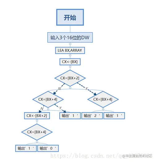 2.首先初始化ARRAY数组中,由于占用两个字节,所以又将数组赋值给AX,BX,CX进行操作,关键在于两两对比得出大小,将输出的0,1,2封装成模块调用,当得出结果就立即输出结果