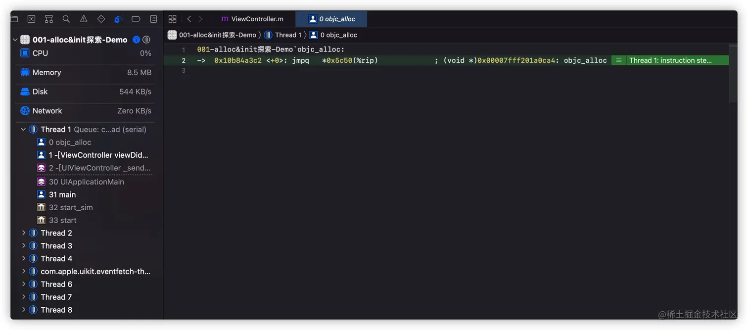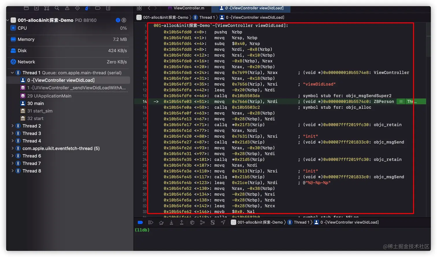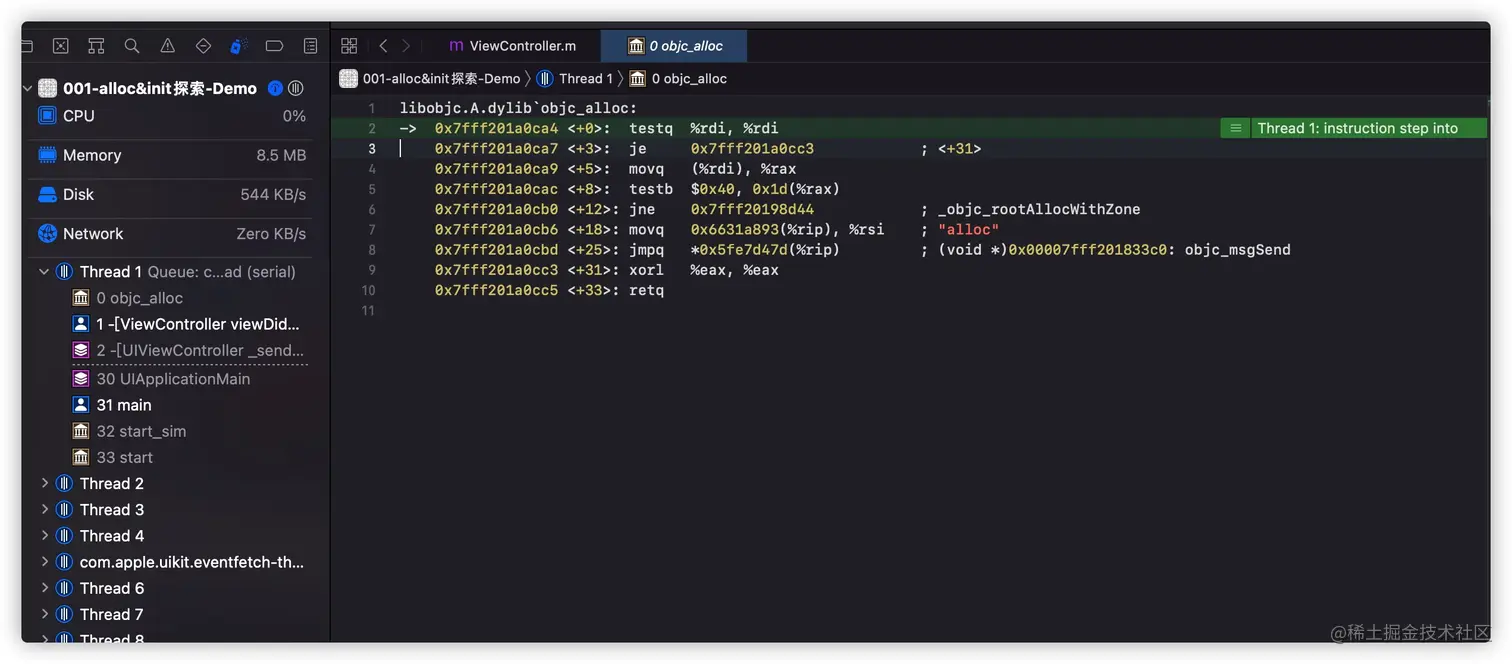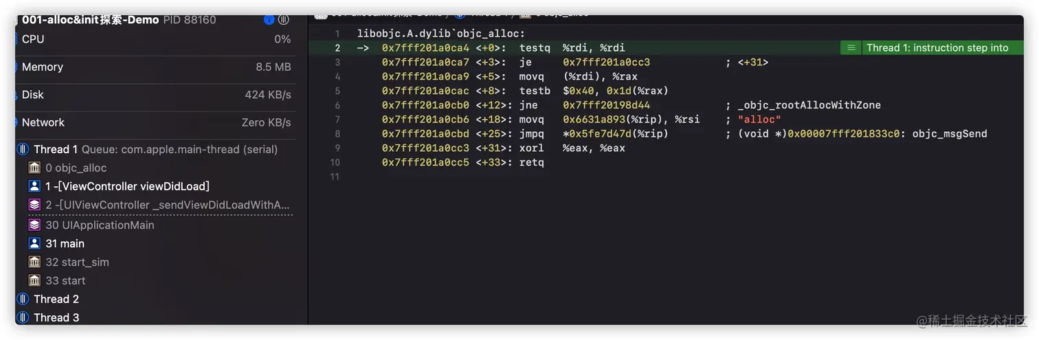 虽然我们看不懂汇编,但是通过call->symbol stub for: objc_alloc我们也可以大致理解,接下来函数会调用objc_alloc这个符号所代表的的函数。
