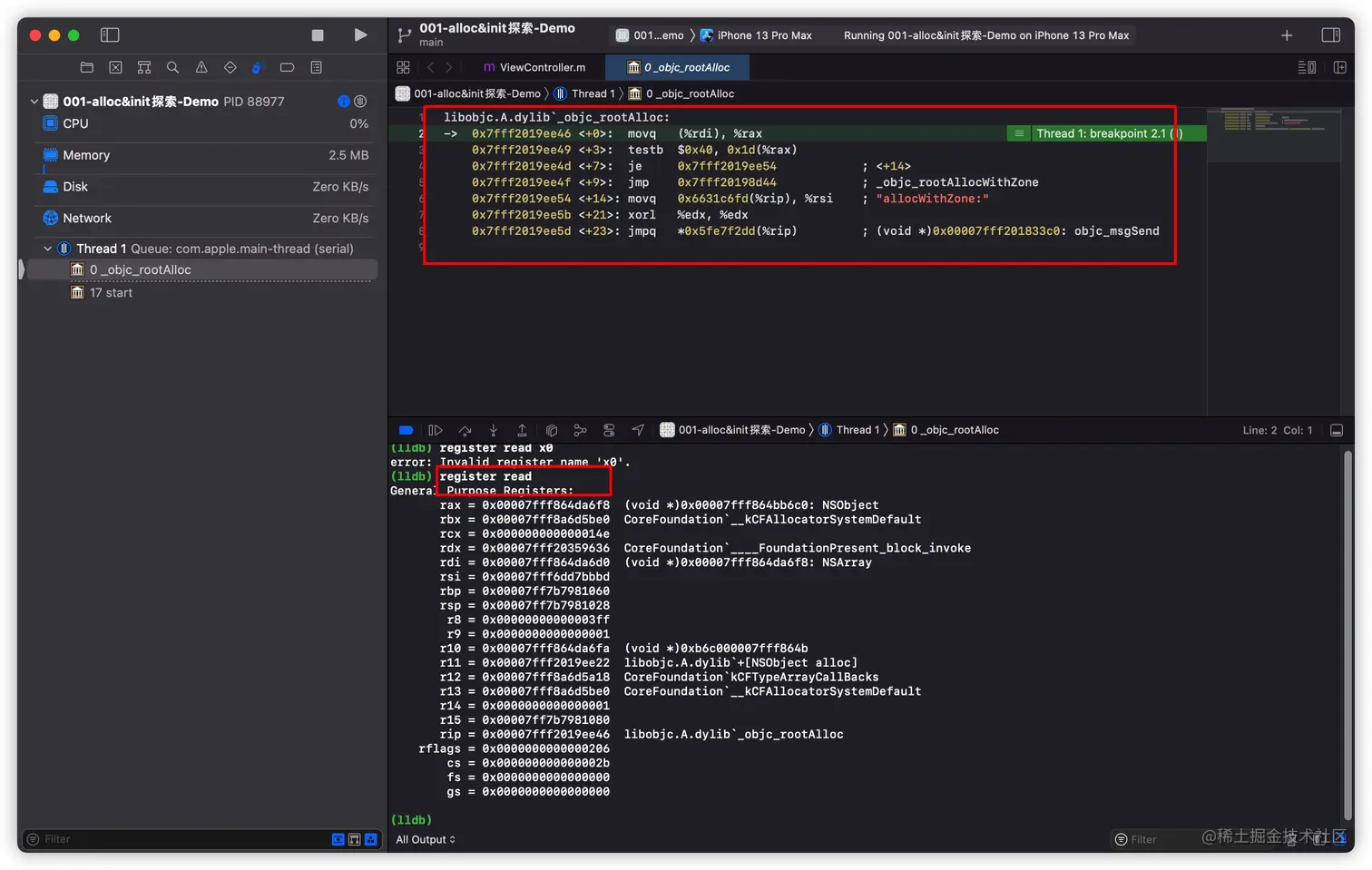 _objc_rootAlloc的符号断点,再次执行其中我们使用register read指令读取寄存器的内容。
