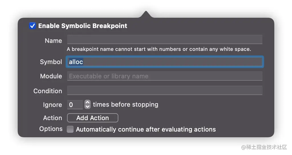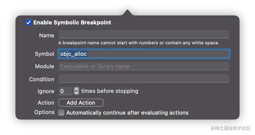 各字段含义如下: Symbol:填入你想设置断点的方法 (例如:-[NSException raise],-号是实例方法,+号是类方法)。 你也可以输入:objc_exception_throw malloc_error_break //跟踪调试释放了2次的对象 -[NSObject doesNotRecognizeSelector:] //向某个object发送没有的方法