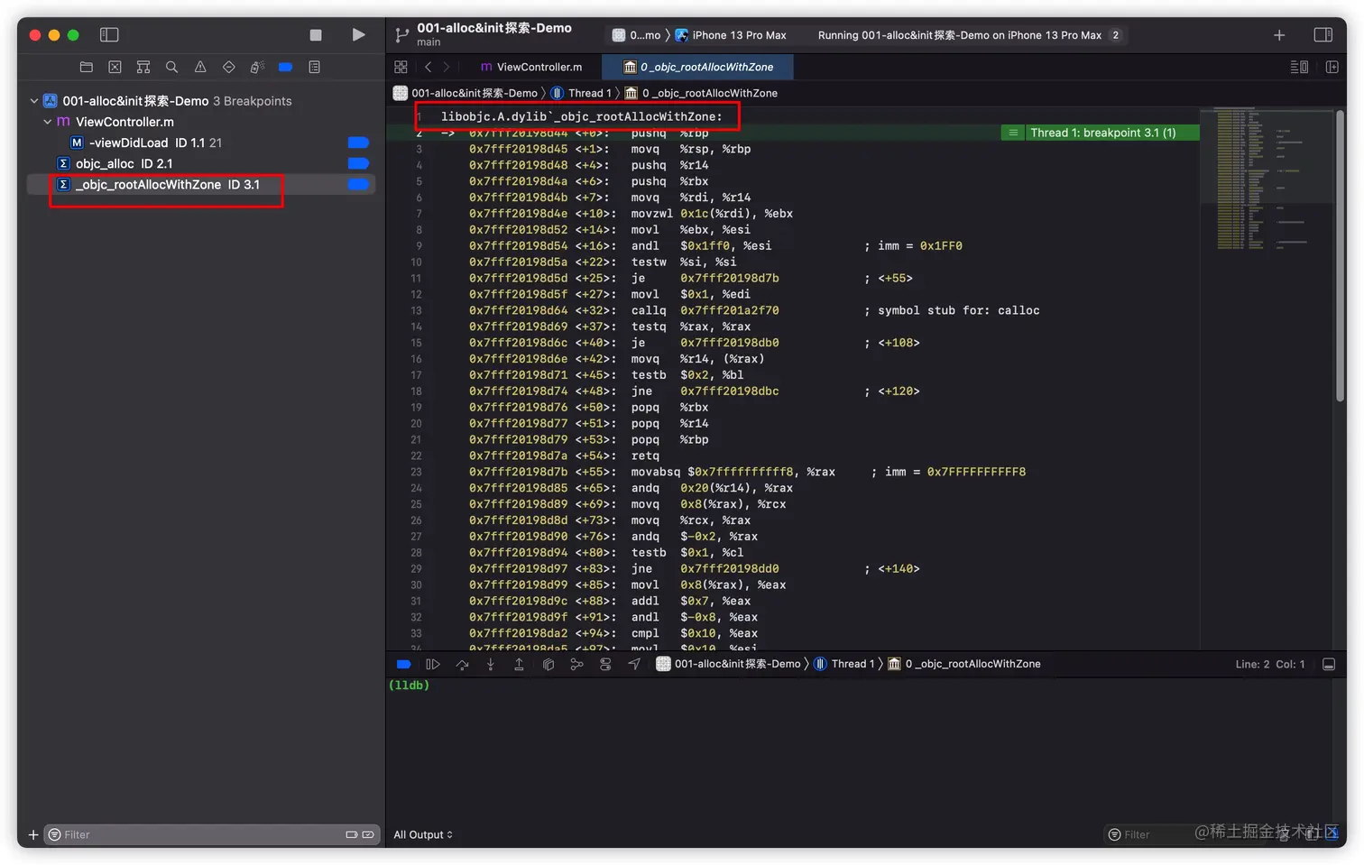 如果我们还想继续查看_objc_rootAllocWithZone和objc_msgSend函数的底层逻辑,那么可以再将这两个函数设置符号断点,进一步查看底层代码逻辑。