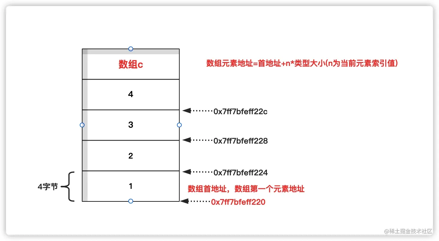 &c[1]的地址0x7ff7bfeff224与&c[0]的地址0x7ff7bfeff220`相差4字节。 - 指针在数组中支持+,-算数运算,指针+1,表示指针从当前位置移动到下一个元素位置,即数组元素地址=首地址+n*数组元素类型大小(n为当前元素索引值)