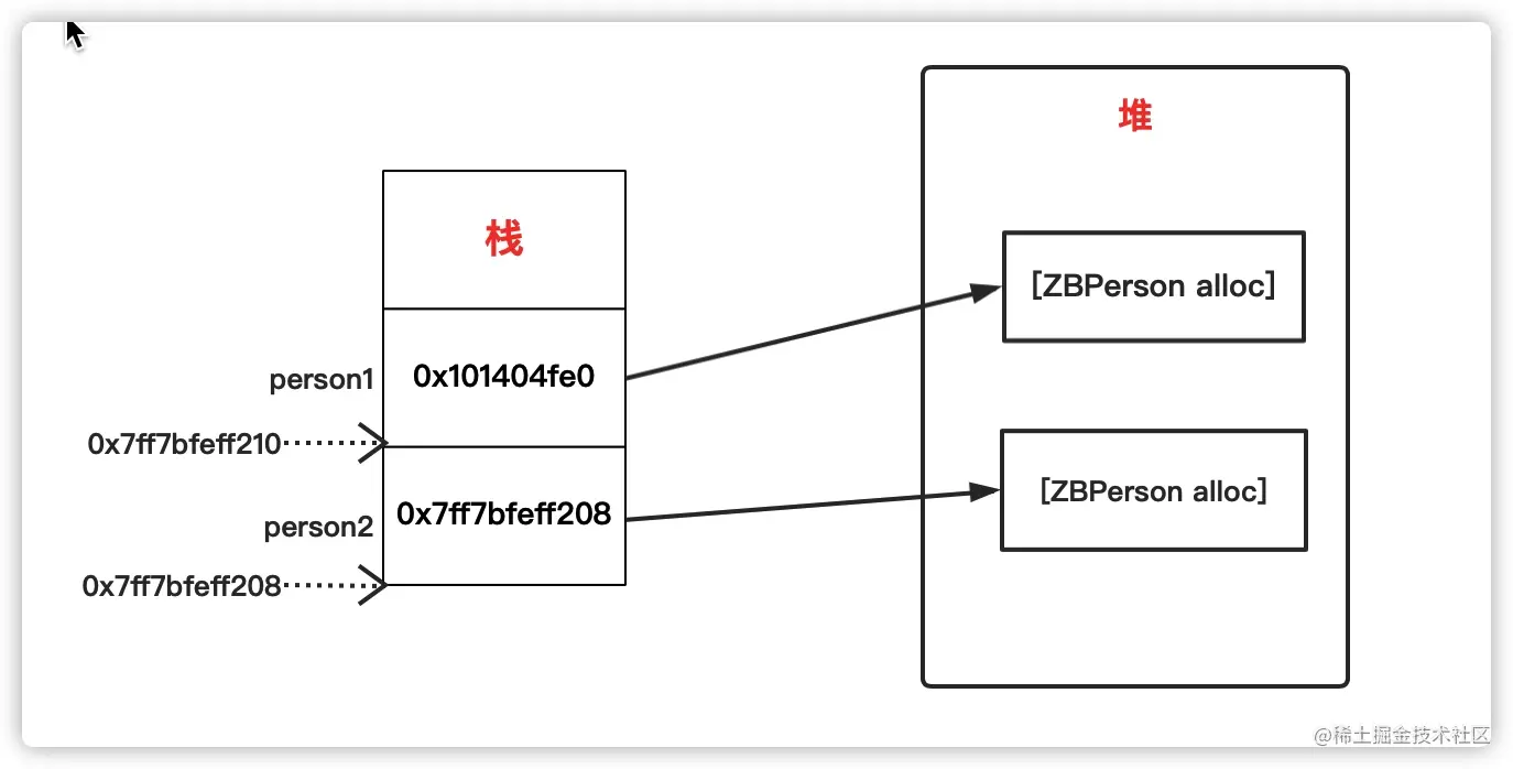 ZBPerson *person1 = [ZBPerson alloc]为例,对象执行alloc函数以后,会在堆中申请一块内存,同时返回内存地址 - 在栈上位person1开辟一块内存,保存堆返回的内存地址。