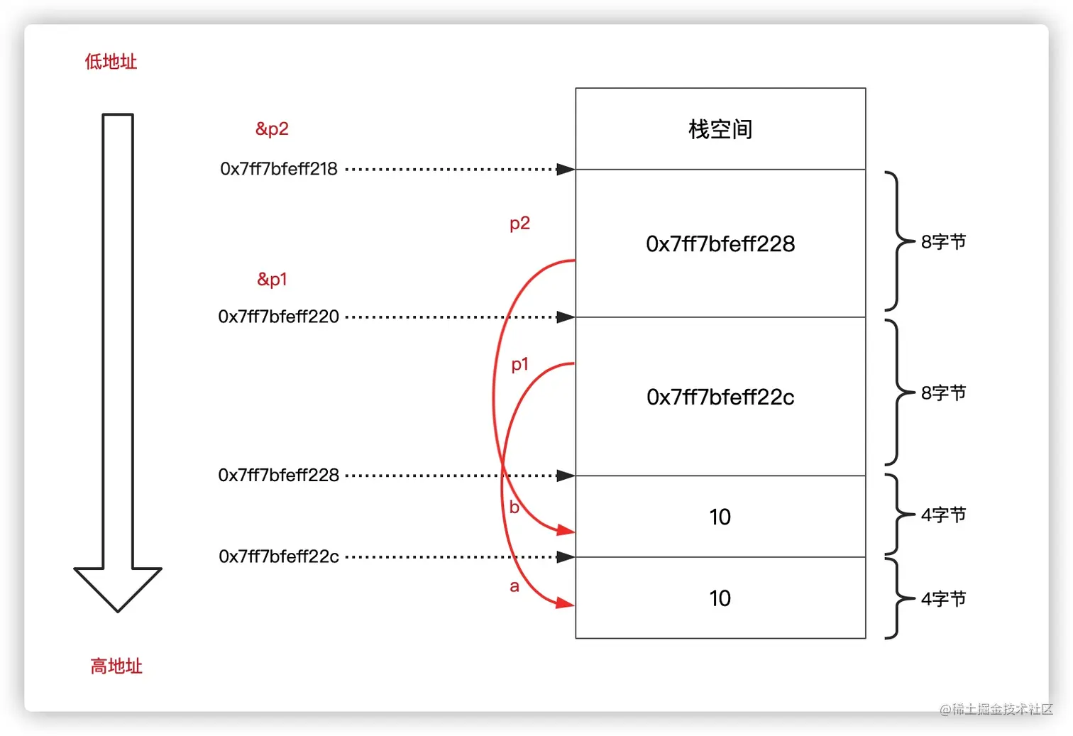 - 变量a与变量b是连续分配的,相差4字节,正好是int所占用的字节大小,而且都在栈上分配