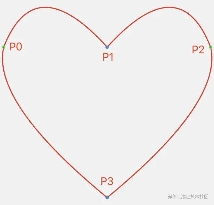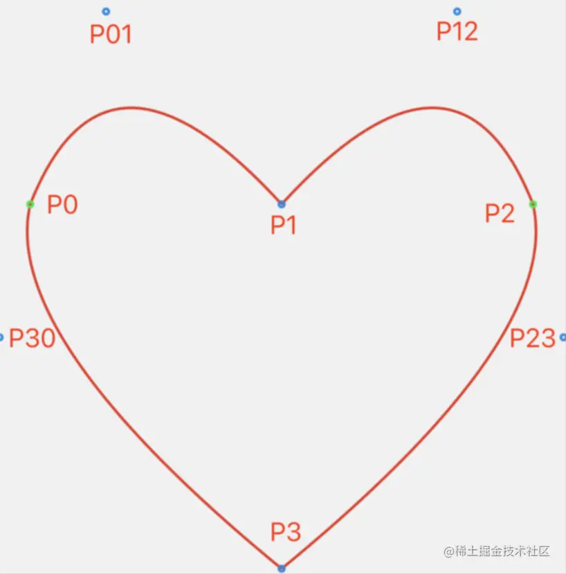 首先我们来看爱心使用二阶贝塞尔曲线如何实现。如下图所示,爱心可以分为4段曲线,分别是 P0-P1,P1-P2,P2-P3和 P3-P0之间的四段曲线,其中 P0-P1和 P1-P2是对称的,P2-P3和 P3-P0也是对称的。