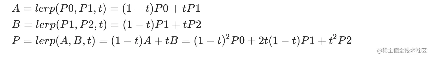 代码实现的关键是调节点位参数和封装一个获取二阶贝塞尔曲线的函数方便重复调用,然后就是设置一个 t 变量,通过循环等间隔生成曲线的一些列点就可以绘制出曲线了。下面是根据三个控制点获取二阶贝塞尔曲线在 t 时刻点的位置的方法。