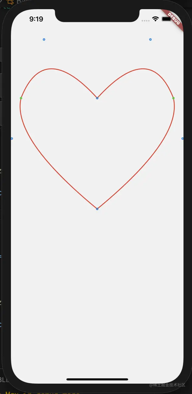 其他曲线段的代码相同,只是控制点不同而已,实现的效果图下,为了方便查看控制点位置和曲线的关系,我们将控制点也画了出来。完整代码已经上传至:CustomPaint 绘制相关代码。