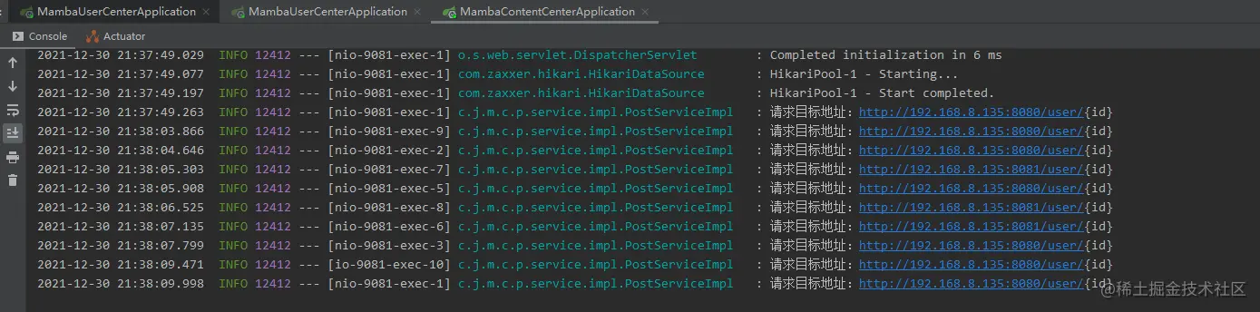 在内容中心模拟发送请求,观察发现请求随机打到8080或者8081两个端口的实例上,至此我们的客户端负载均衡算法实现完成。