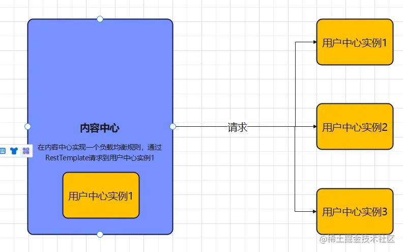 客户端负载均衡实现思想其实很简单,我们只需要在获取实例列表instances中,随机获取列表的实例instance,而不是获取第一个,这样也就能达到随机负载的目的,假设现在有三个用户中心实例,内容中心已经可以通过DiscoveryClient获取到用户中心信息,现在内容中心实现一个负载均衡规则计算将请求通过RestTemplate请求到某一个实例,这种就是客户端侧负载均衡:
