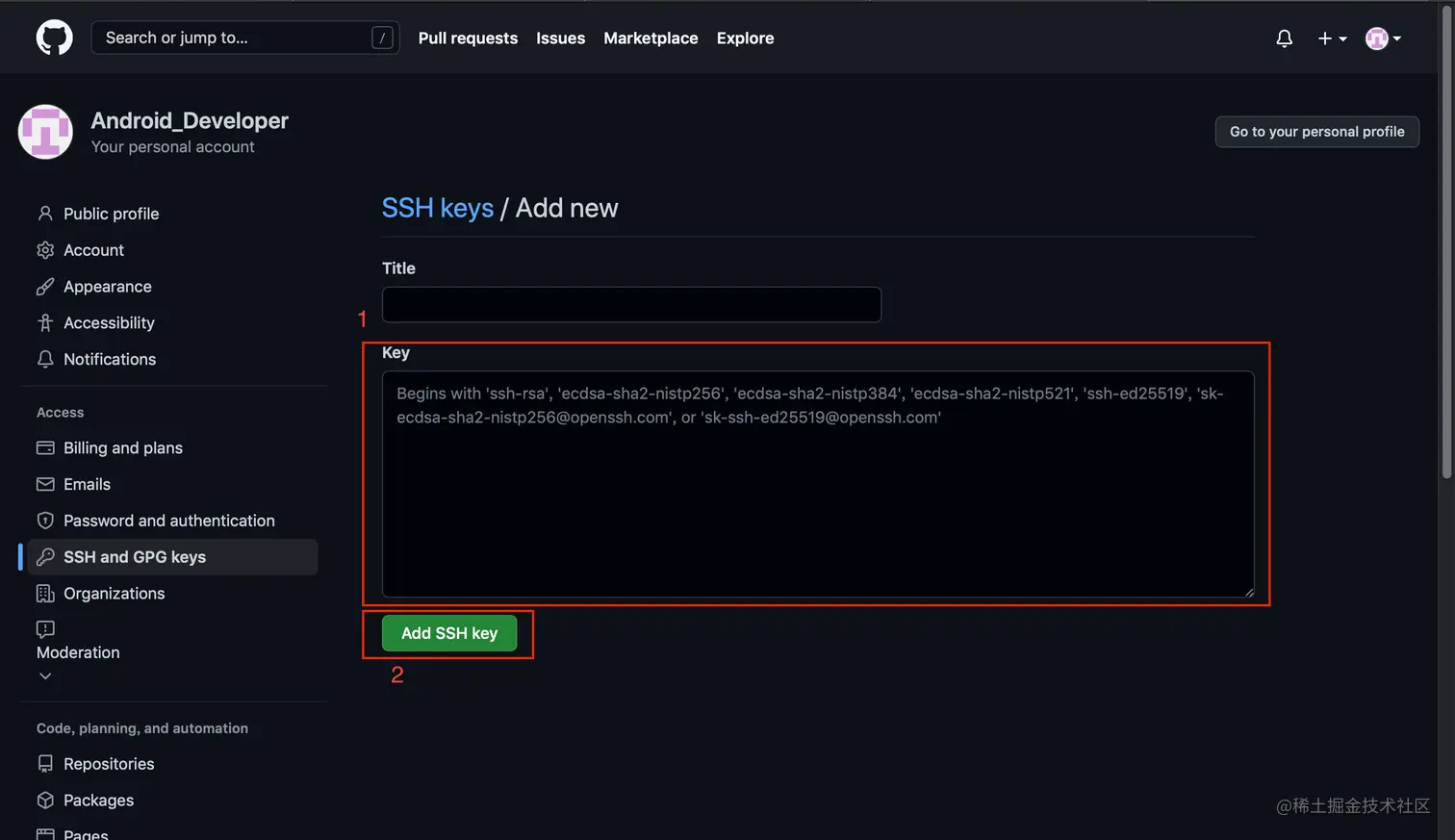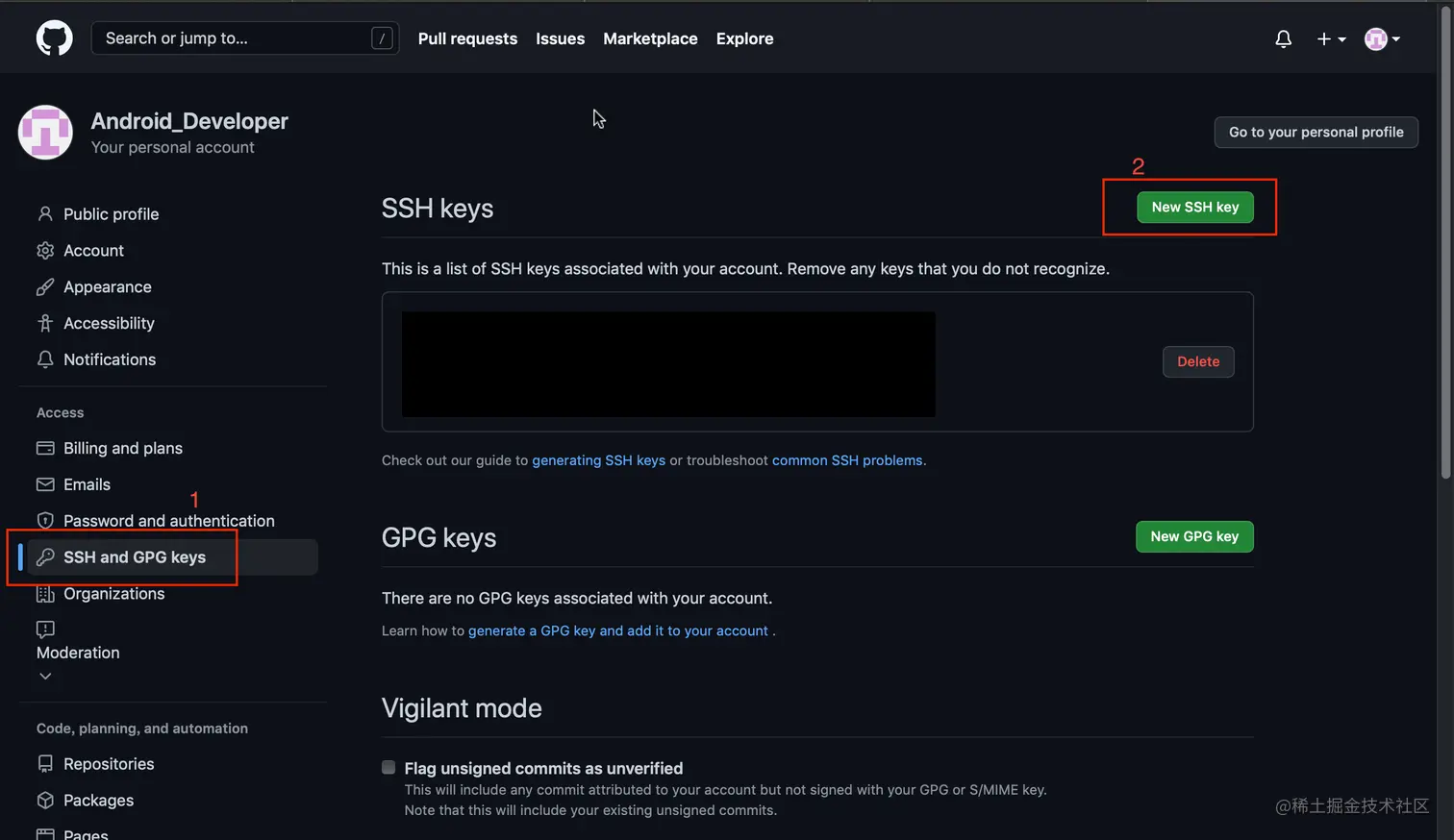 新页面上依次点击【SSH and GPG keys】->【New SSH key】