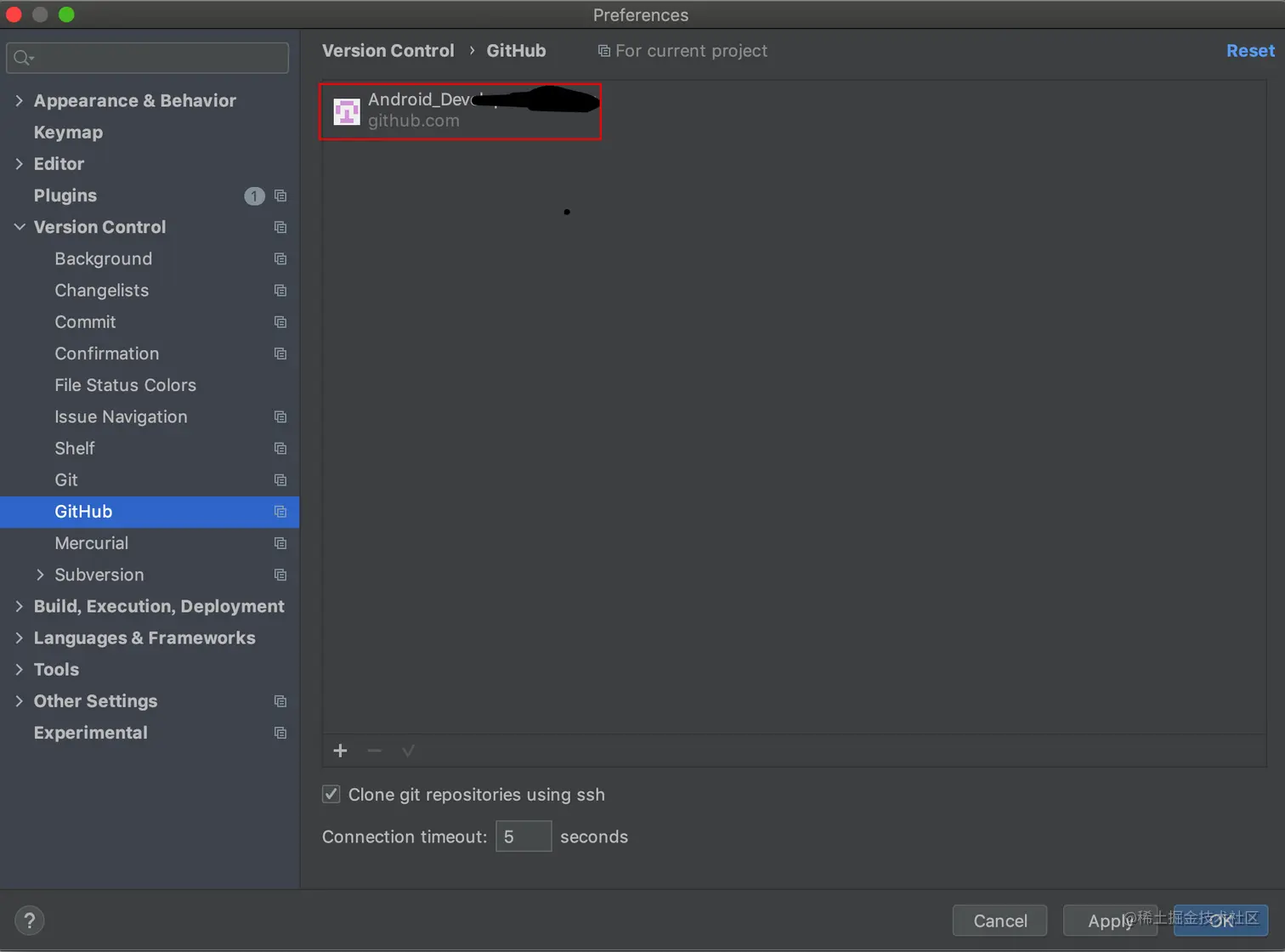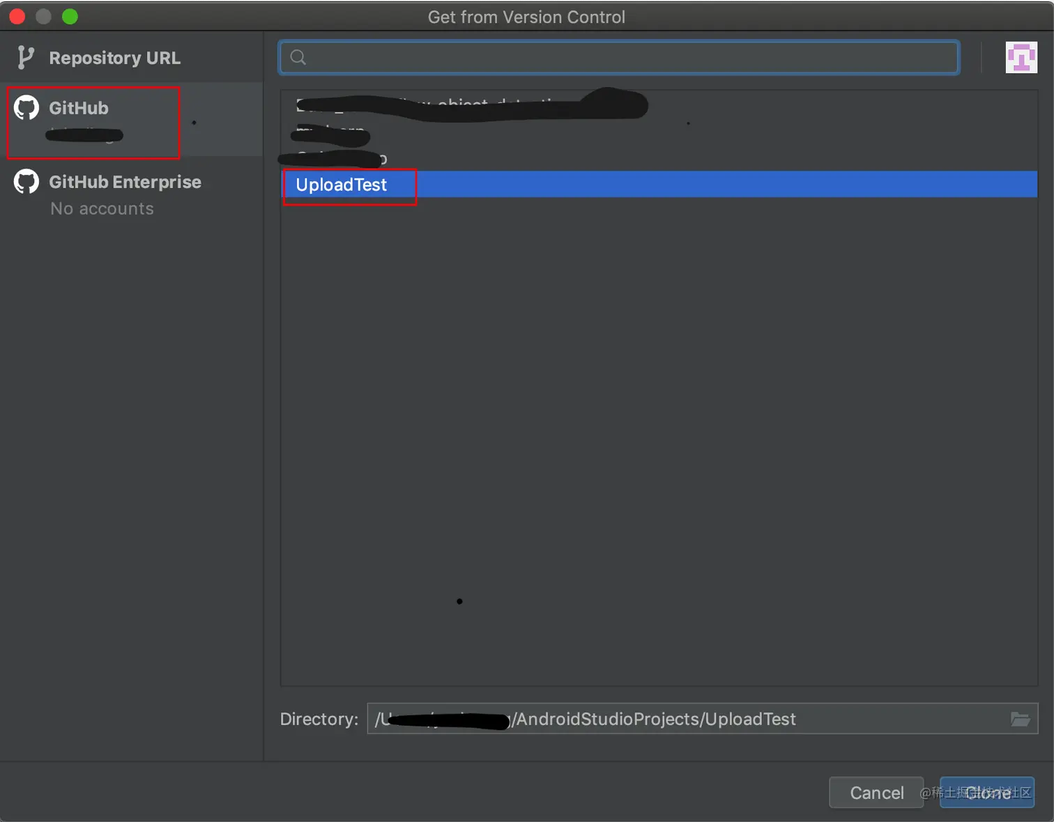 在弹出框中选择【Github】,然后可以看到该账号对应的所有代码仓库,这时选择需要下载的仓,比如上文刚上传的UploadTest代码仓,这时点击右下角的【Clone】按钮