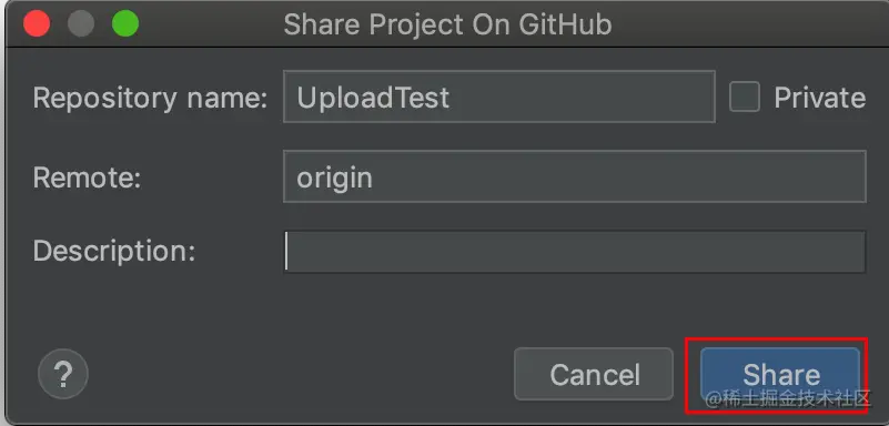 出现如下的弹框,可以修改仓库的名称,以及分支和描述等,不修改使用默认也可以,然后点击【Share】