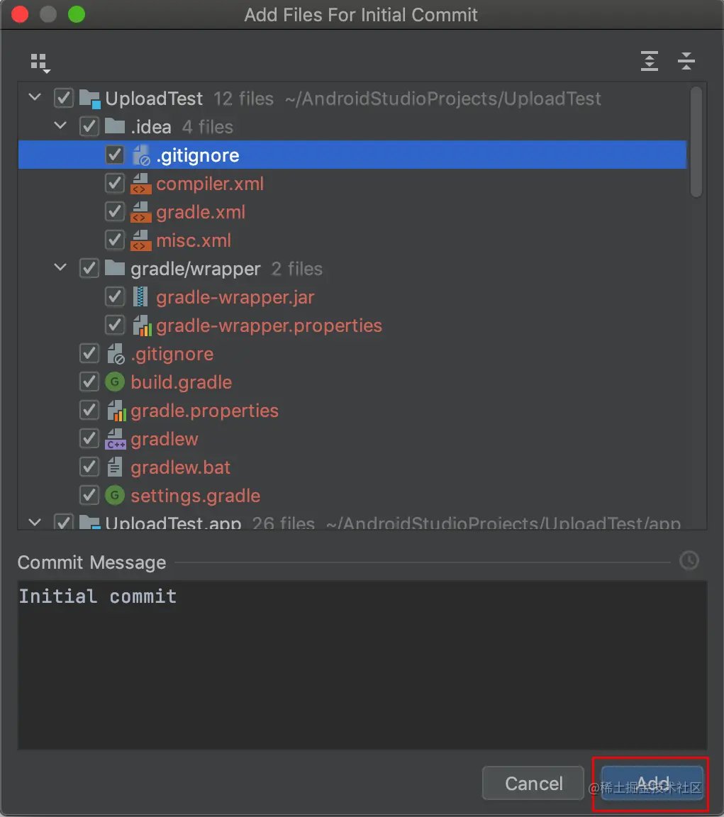 接着就会跳转到提交代码的对话框了,默认勾选了需要上传的文件,工程在创建时,AS已经智能的把一些不需要上传的文件或目录写在了.gitignore文件中,所以不需要做过多的修改。在填写Commit Message之后点击【Add】