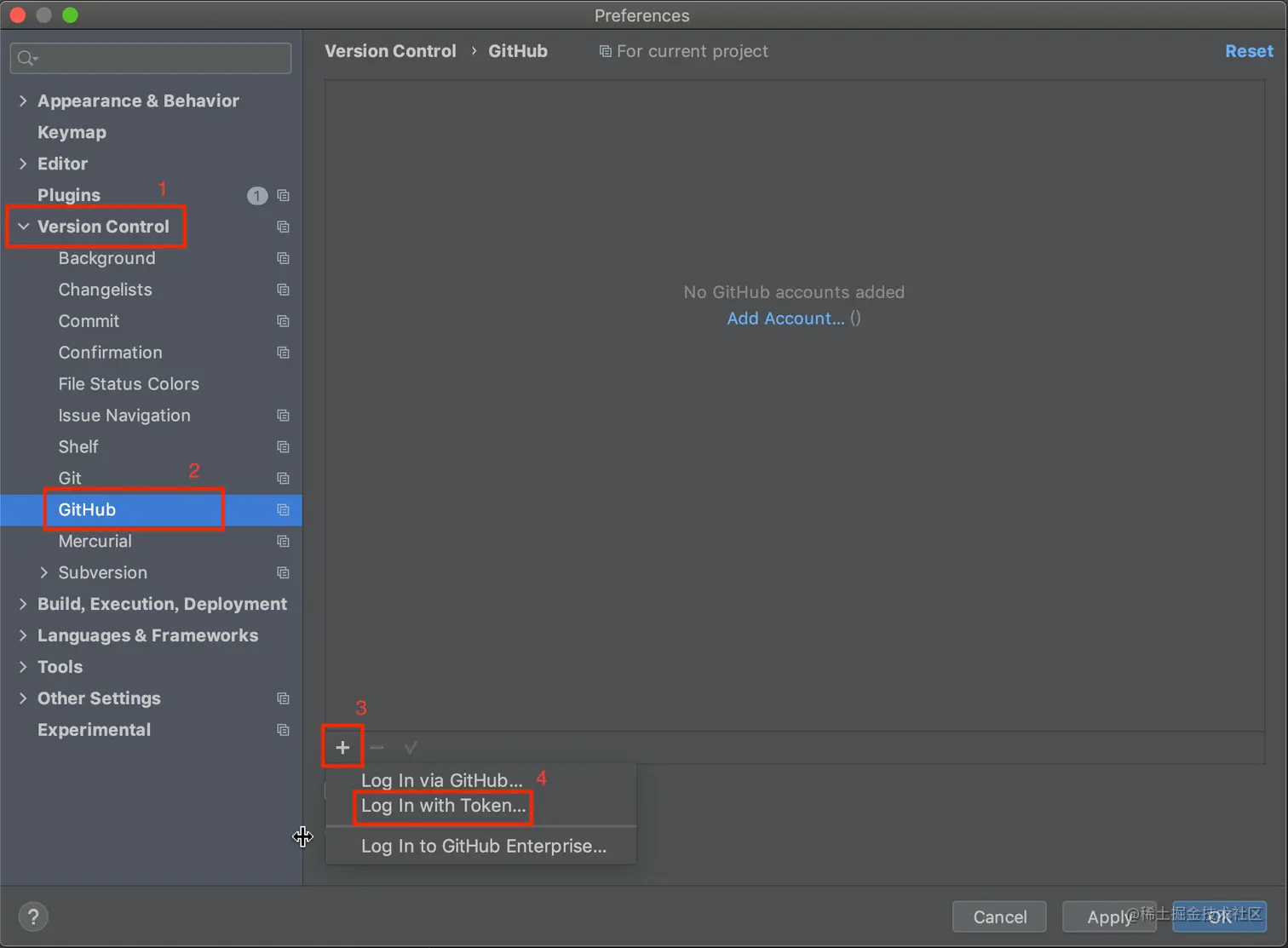 还是停留在该界面,依次点击【Version Control】->【GitHub】->【+】->【Log In with Token...】(注释:没有选择【Log in via GitHub...】原因是当前网络环境访问不了account.jetbrains.com)
