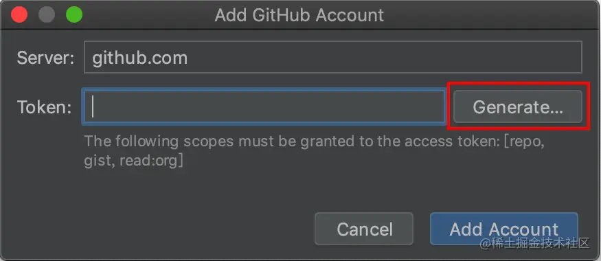 将复制的access token粘贴到Android Studio的弹框中,并点击【Add Account】