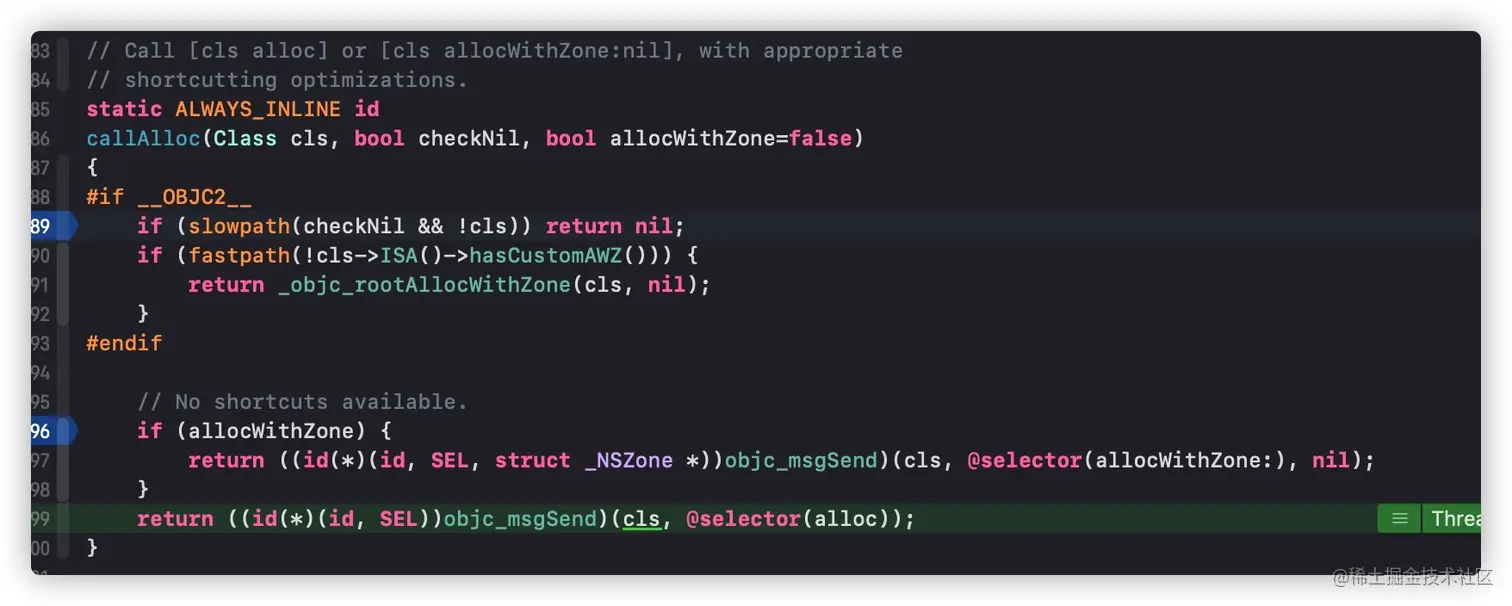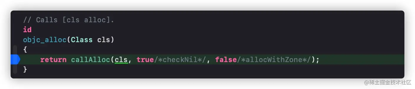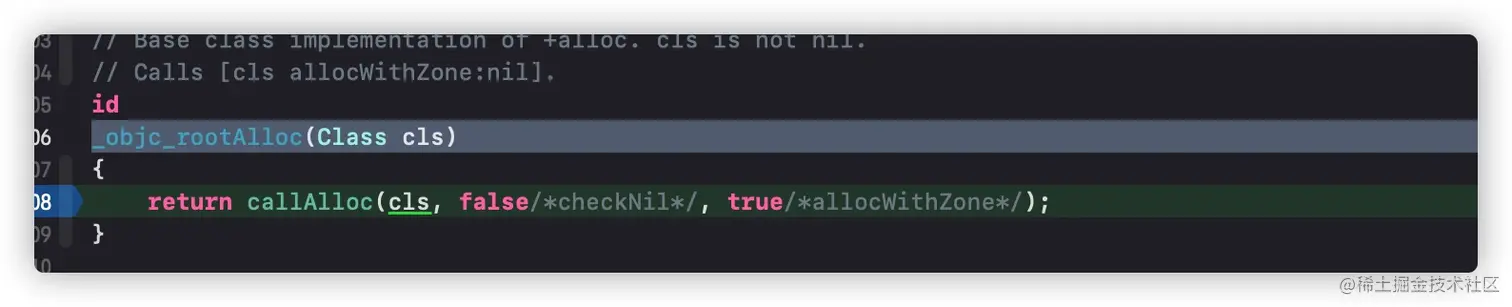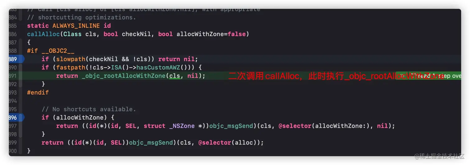 接下来的代码执行,如果不清楚到底走哪个分支,那么可以通过将callAlloc函数设置符号断点来调试查看函数接下来具体执行的内容。