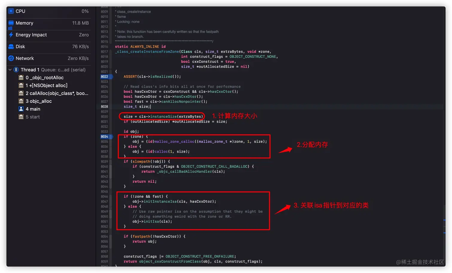 首先在alloc函数地方打个断点,执行alloc函数时按住ctrl点击调试小箭头,即可进入到底层函数