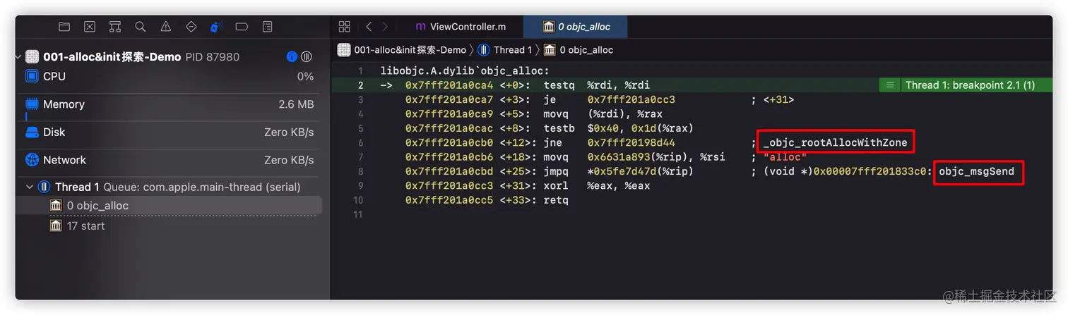 如果我们还想继续查看_objc_rootAllocWithZone和objc_msgSend函数的底层逻辑,那么可以再将这两个函数设置符号断点,进一步查看底层代码逻辑。