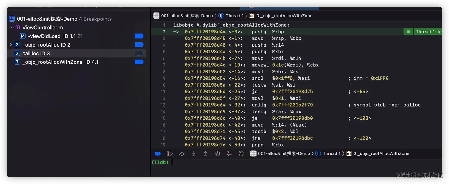接下来的代码执行,如果不清楚到底走哪个分支,那么可以通过将callAlloc函数设置符号断点来调试查看函数接下来具体执行的内容。