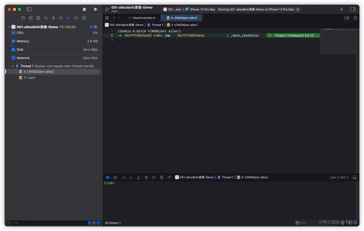 虽然我们看不懂汇编,但是通过call->symbol stub for: objc_alloc我们也可以大致理解,接下来函数会调用objc_alloc这个符号所代表的的函数。