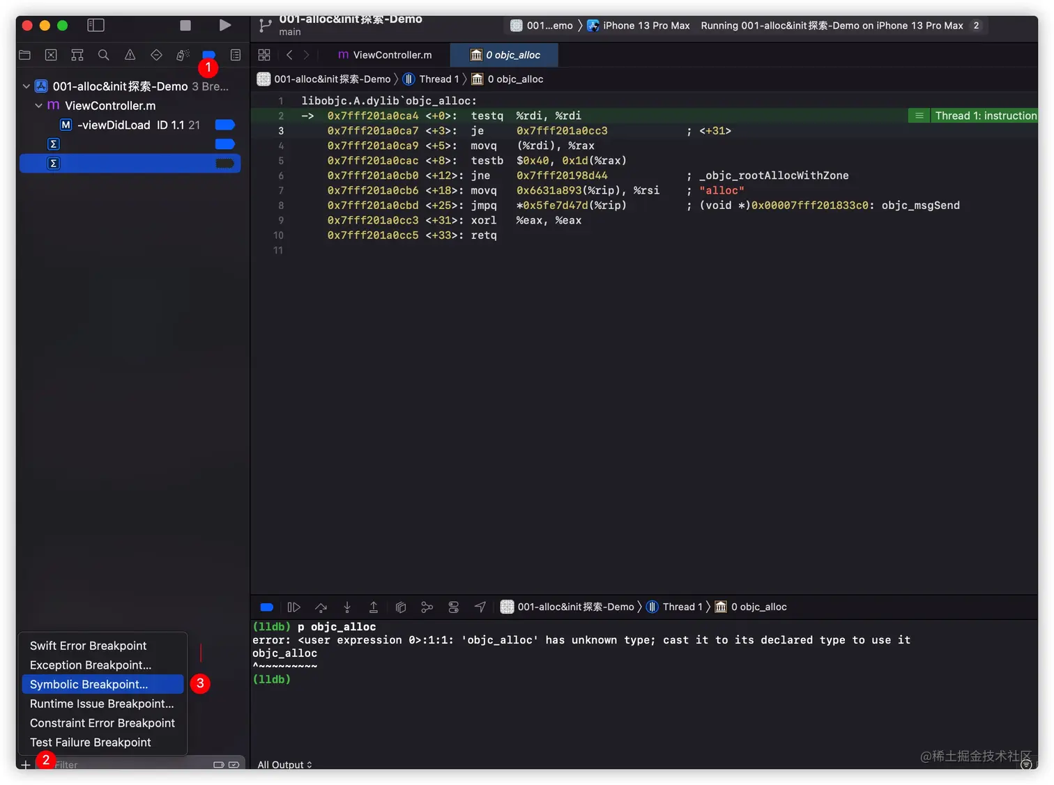 如果我们想要进一步了解objc_alloc函数的底层代码,那么我们打一个符号断点,查看底层代码的具体执行逻辑