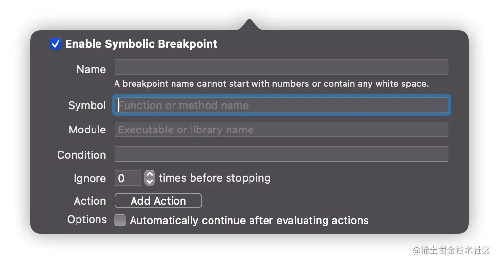 在探索之前,我们先了解一下Xcode的符号断点符号断点(Symbolic Breakpoint)