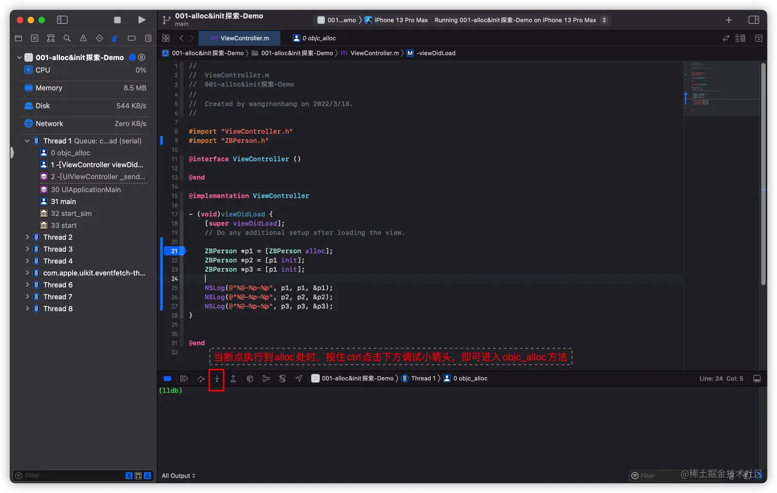 首先在alloc函数地方打个断点,执行alloc函数时按住ctrl点击调试小箭头,即可进入到底层函数