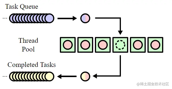 FQueuedThreadPool 是 UE4 中抽象出的线程池。线程池有若干个 Worker 线程,和一个同步队列构成。 UE4 把同步队列执行的任务抽象为 IQueuedWork . 线程池的同步队列,就是一个 IQueuedWork 的队列了。借用 wiki 上线程池的图, UE4 的 FQueuedThreadPool 也是如图中所示的结构:
