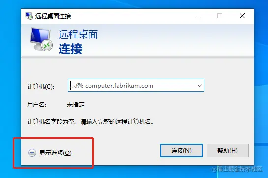 接着打开远程桌面程序,进入远程连接界面,点选红框位置的选项按钮