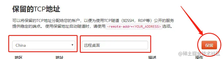 在这里我们需要填写几项基本参数,第一个红框我们选择China,第二个红框可以随便填,为方便记忆,我填了“远程桌面”。这两项信息填写完成后,就可以点击右侧的“保留”按钮,cpolar会自动生成一条连接电脑的数据隧道,我们之后的远程办公就要通过这条通道进行。